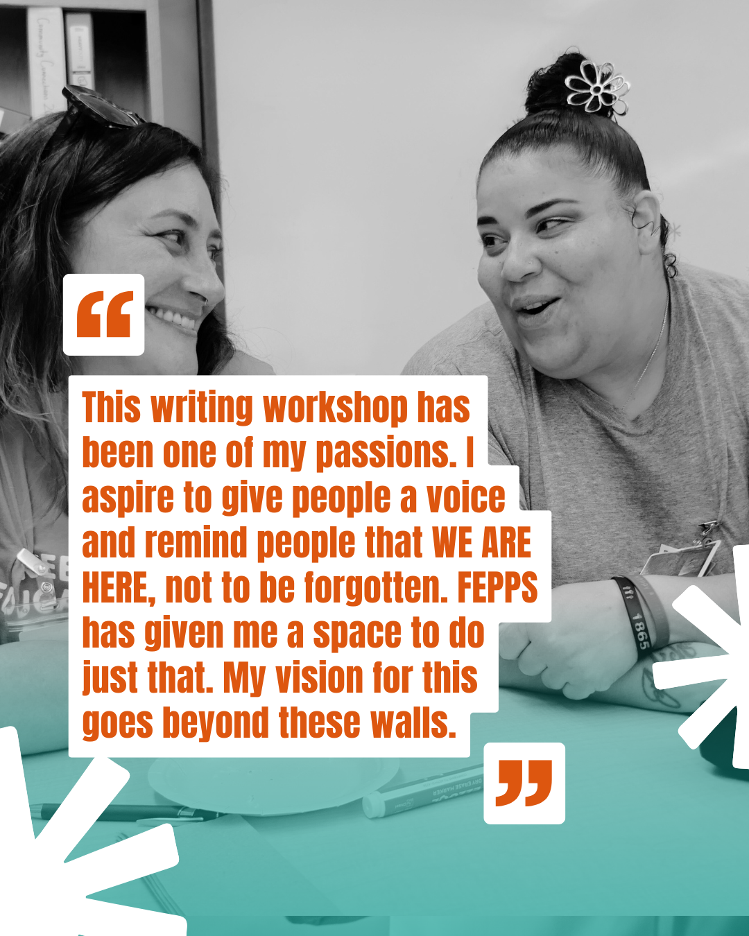 Image: Alyssa, FEPPS Executive Director, and Bonnie, Founder and co-facilitator of the Creative Writing Group, smile. A quote from Bonnie reads: “This writing workshop has been one of my passions. I aspire to give people a voice and remind people that WE ARE HERE, not to be forgotten. FEPPS has given me a space to do just that. My vision for this goes beyond these walls.”