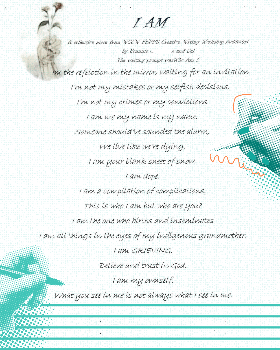 Following the Sankofa project, the group has stepped into writing short stories and exploring genres like creative nonfiction, broadening their skills and their confidence. Participants also worked on a collective poem, answering the prompt “Who Am I?”